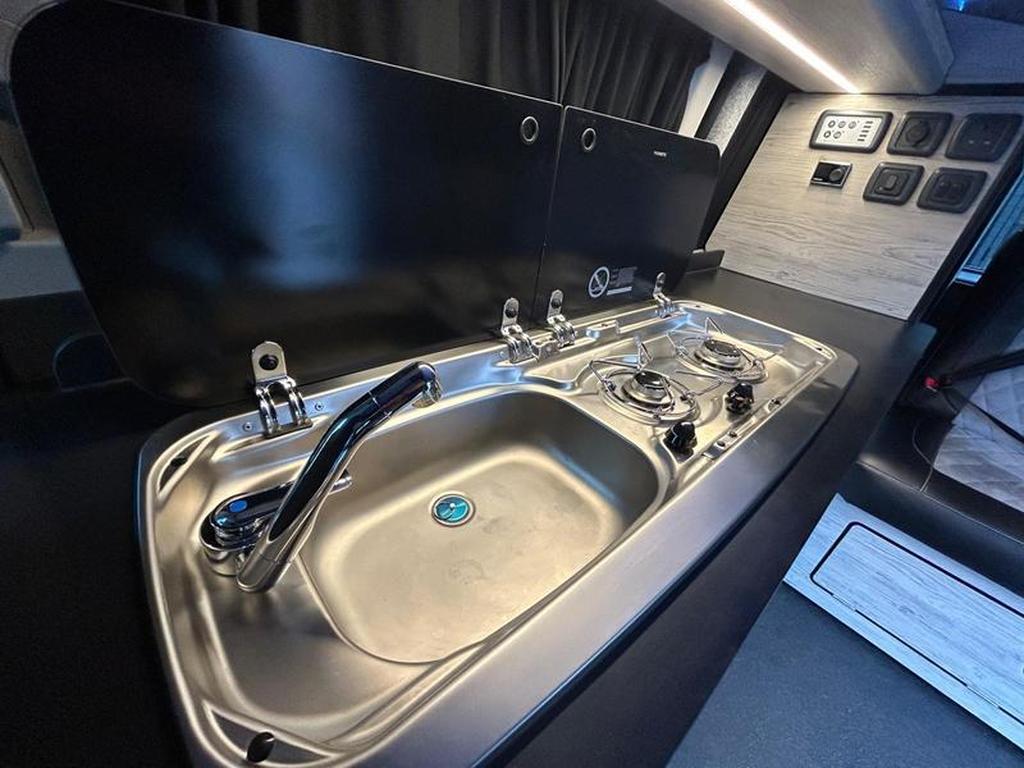 This campervan has a TUV-approved skyline Pop-Top roof with panoramic canvas on a black vinyl material with upper bedboard and mattress and lots of space for your feet upstairs.
