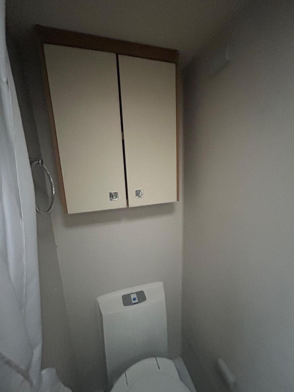 The interior is elegantly appointed with an end-combined washroom and shower, complete with a shower curtain, toilet, corner hand wash basin vanity unit, and ample mirror space. A wardrobe provides ample storage for clothing, while a free-standing dining table neatly conceals away when not in use.